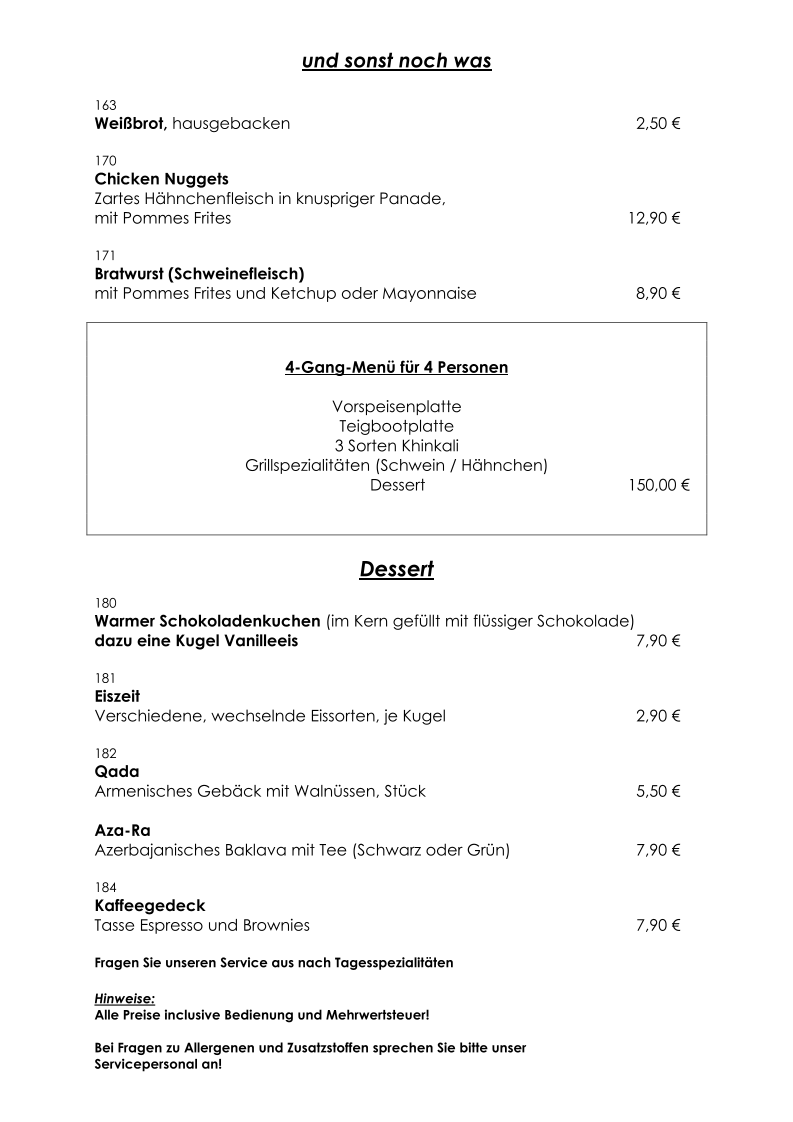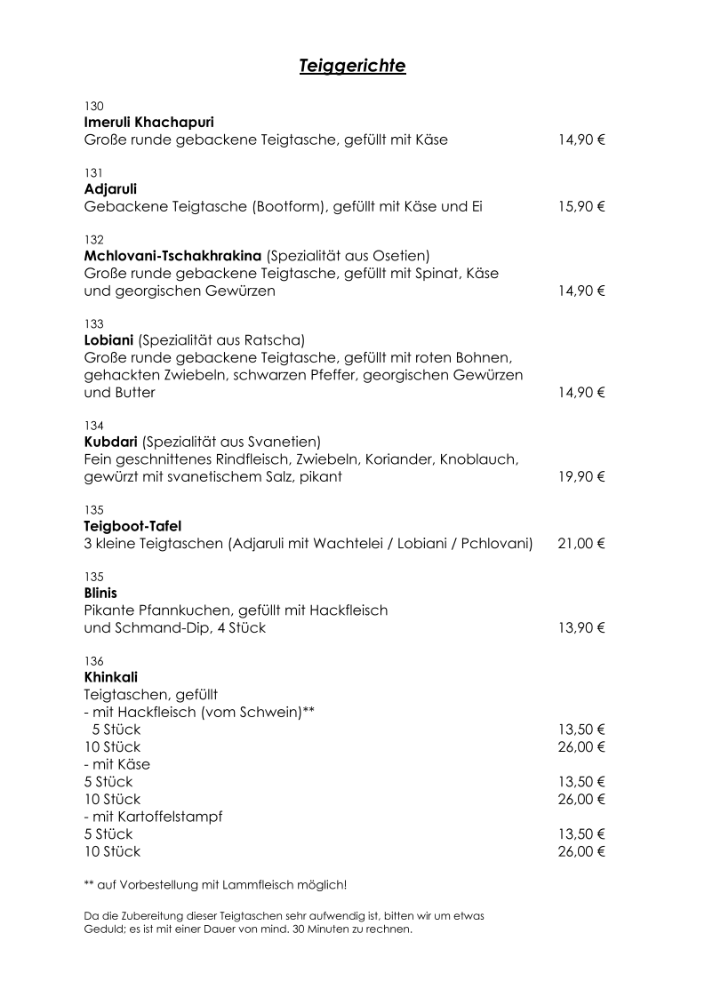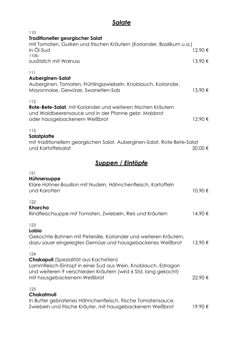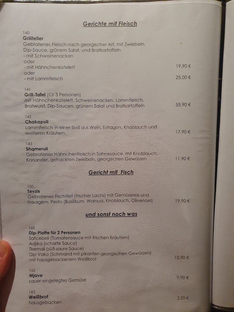 “ This is the first time I visit a Georgian restaurant and the food was unexpectedly impressive. To be honest, I am definitely a meat lover but if I could only order one dish on the menu, I would order the vorspeisenteller. It’s vegan but its rich flavor provides fantastic experience to your tongue. This is the best appetizer I’ve ever have so far. The grilled lamb was perfectly done, even the potatoes. And khinkali are also perfectly seasoned and incredibly satisfying. Compared to previous dishes, the Teigboot is less impressive. it’s not that this cuisine is not good but others’ are so memorable. Thanks to the vorspeisenteller, we finished four dishes with two people, actually we would like to order more but it was too late. The atmosphere is also very cozy and staffs are welcoming. They all make the dining experience more enjoyable. :) ”