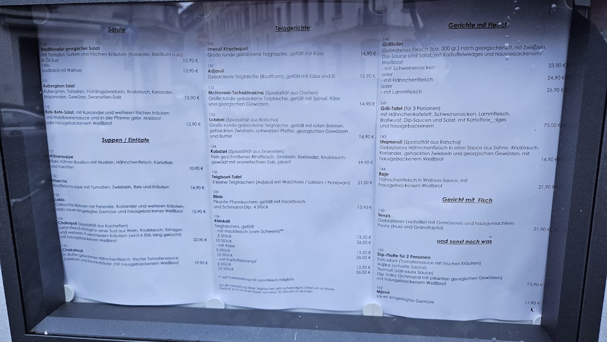 “ Ended up here because we couldn't get a seat across the street. Glad it happened. If your looking for off the beaten path ethnic food, search no more. Not sure what out waitresses name was, but she explained as best she could in English and we ordered. The Grillteller mit Schweinenacken was excellent. Lots of flavor and plenty to eat. The spicy Ajika was an amazing dip. We also got an order of Khinkali Hackfleischfüllung was very good also. Very lively place. Glad we ended up here on accident. ”