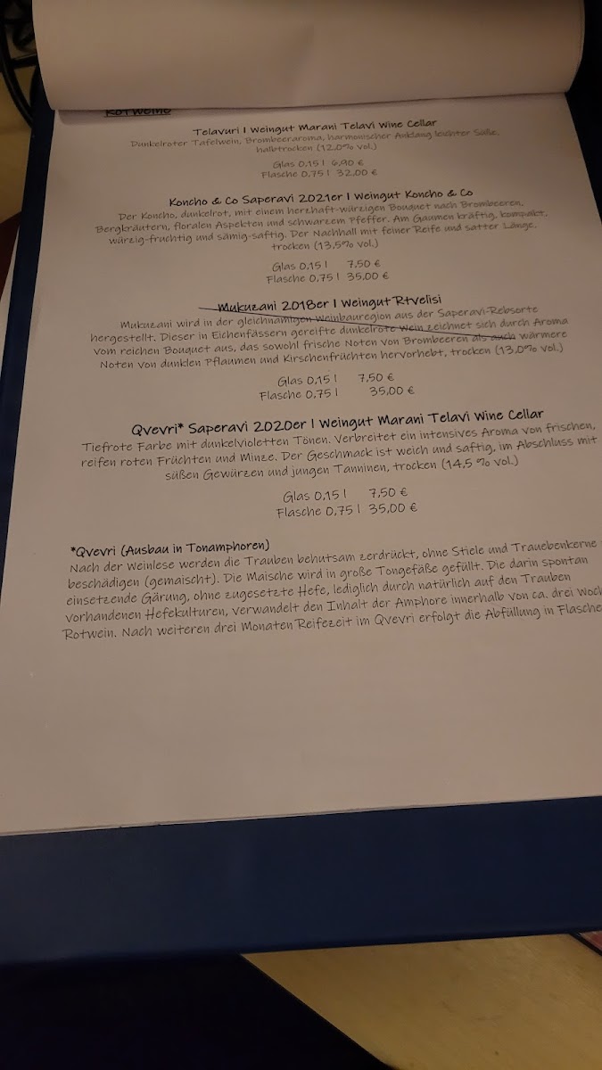 “ I was looking for a Georgian restaurant in Cologne and just bumped into this gem on the way from my hotel to the center. I walked in and asked for a reservation for the same evening. We had a great dinner with my husband and kids. I am a huge fan of Georgian food and have tried it in many countries. This restaurant is a good example of a small and cosy place with great food and Georgian atmosphere. We have tried chachapuri, phkali, imeriuli and of course khinkali. It was all very delicious! Especially the khinkali - juicy and full of flavour. The waiter was super friendly. And we enjoyed our evening due to the food and his friendly service. ”